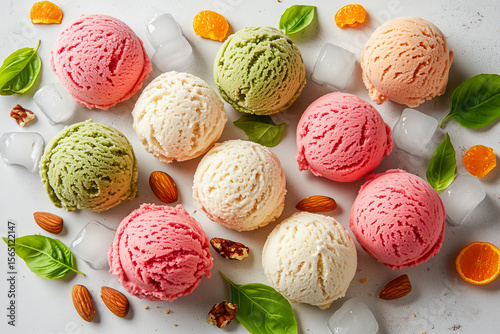 カラフルなアイスクリームスクープとナッツ、フルーツ