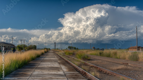 男性が無人の駅ホームで迫る雲を眺める昼下がり