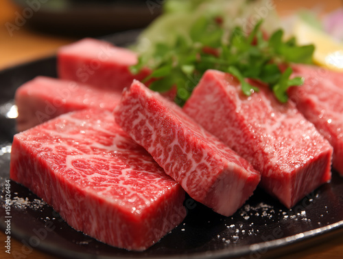 霜降り和牛の厚切り肉が並ぶ高級焼肉の盛り付け