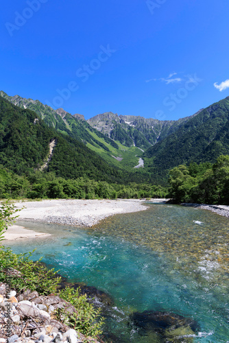 夏の上高地、梓川と北アルプスを望む清流の絶景風景