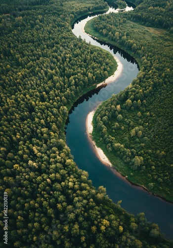 緑豊かな森を蛇行する清流、上空から眺める雄大な自然美