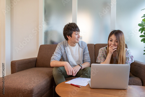 リビングルームでソファに座って話しあっている日本人の男女