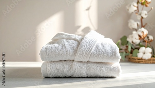 明るいグレーの上にきちんと畳まれたオーガニックコットンのローブ、朝の柔らかな光