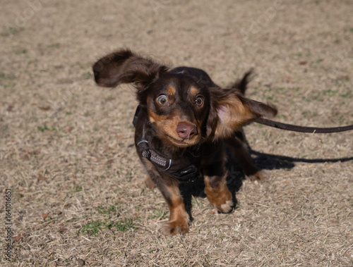 走りながら飼い主を見つめるダックスフンド