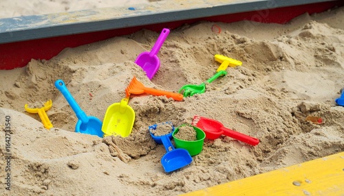 屋外の砂場にカラフルなプラスチック製のスコップやバケツがたくさん置かれています。明るい日差しと砂の質感が、子どもの楽しい遊び時間を想像させます。