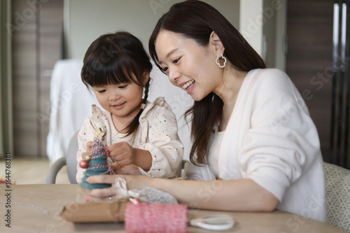 小さなクリスマスツリーに飾りを付ける親子