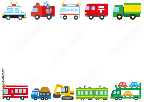 乗り物,車,フレーム,電車,パトカー,枠,旅行,新幹線,駅,交通,働く車,鉄道,バス,警察,郵便,運転,可愛い,かわいい,おもちゃ,セット,列車,移動,旅,観光,レジャー,お出かけ,トラベル,メッセージ,囲み枠,飾り枠,掲示板,お知らせ,伝言板,出発,消防車,ダンプカー,キャリアカー,観光バス,郵便車,トラック,イラスト