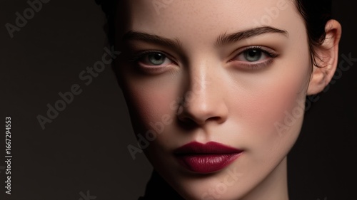 深みのあるワインレッドリップと落ち着いた眼差しが印象的なヨーロピアン女性ポートレート。美容やファッション広告に適した素材。