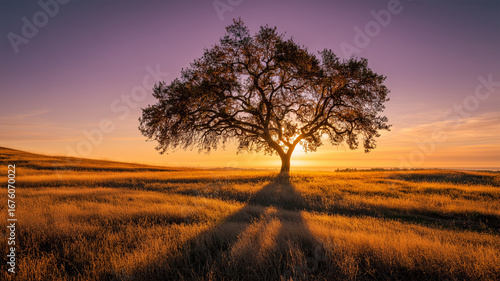 夕暮れの草原に一本の木が立つ