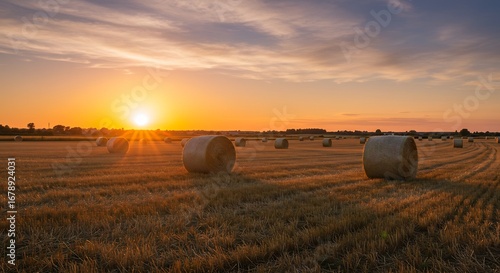 夕焼け空の下、黄金色の麦畑に円形ロールが静かに並ぶ美しい風景が広がる。