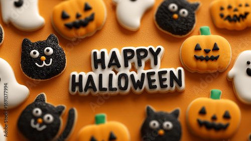 シンプルで清潔感のある白背景にハロウィンの文字、パンプキンや焼き菓子をあしらった平面的でおしゃれな装飾イメージ、バナーや招待状、フライヤーに利用可能なデザインイラスト素材
