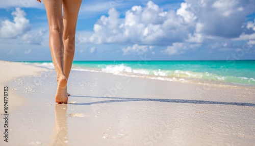 波打ち際を歩く女性の後ろ姿 水に濡れた砂浜に映る青空と足元の画像