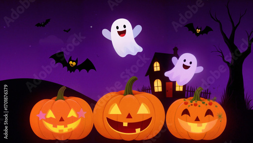 귀여운 유령과 호박, 박쥐가 함께 등장하는 보라빛 할로윈 밤의 일러스트
