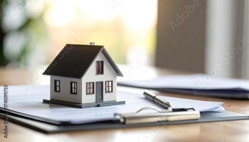 不動産の未来を示す書類の上に置かれた一戸建て住宅模型の象徴