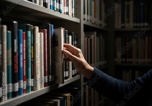 図書館の書架から一冊を取り出す手元のクローズアップ。知識へのアクセスと学習意欲を象徴する、静かなリサーチのシーン