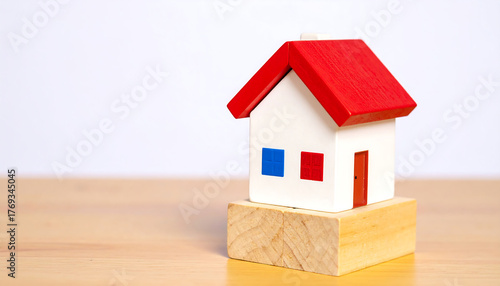 木製台の上に置かれた一戸建て模型が醸し出す洗練と温もりのある印象
