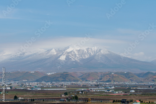 冠雪した十勝岳連峰と富良野の農村風景