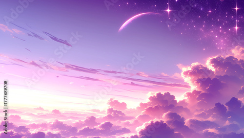 夕焼け空と雲海、三日月と星が輝く幻想的な風景