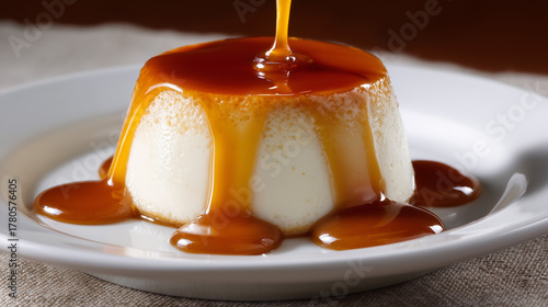 パンナコッタに濃厚なキャラメルソースがかけられた白いお皿に盛られたデザートのクローズアップ