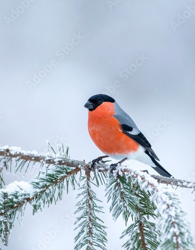 霜に覆われた松の枝に、一羽のウソが赤い胸を輝かせながらとまる。淡い雪が静かに舞い、北欧の冬らしい穏やかで詩的な空気が広がる。