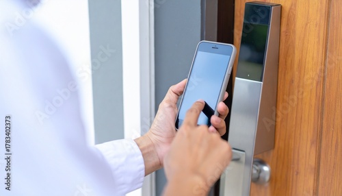 スマートフォンをかざして玄関ドアの電子鍵を遠隔で解除する人物の行動をとらえた場面