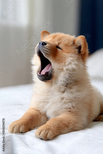 ベッドで大きなあくびをする子犬
