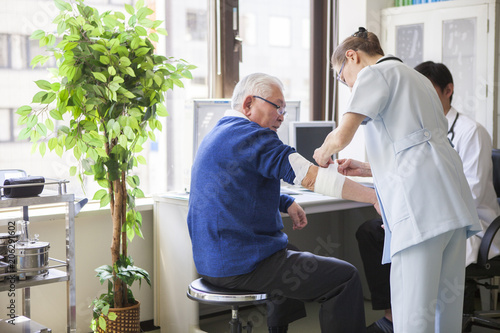 看護師が、医師の指示のもと、患者の老人の腕に包帯を巻いている。