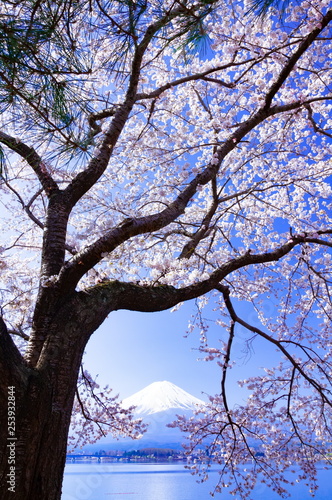 富士山と満開の桜、山梨県河口湖にて