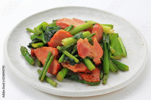 小松菜、アスパラ、ベーコンの炒め物