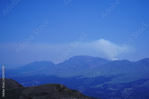 噴煙を放つ阿蘇山と阿蘇町の風景