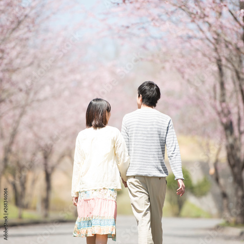 桜並木道を歩くカップルの後姿