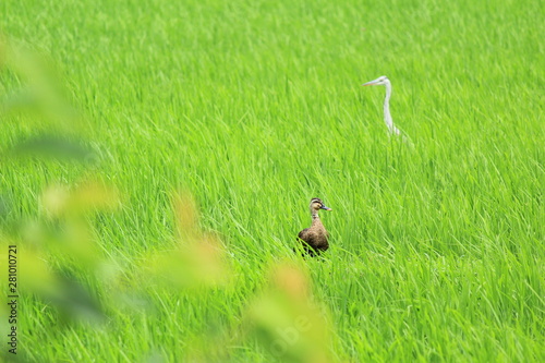 田んぼの中のサギとカモ