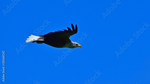 青空バックに悠然と飛ぶオジロワシ