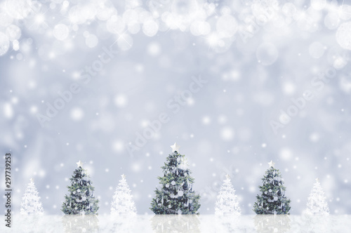真っ白なクリスマスツリーと粉雪のバックグラウンド