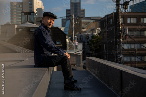 屋上にいる、ハンチング帽を被ったシニア男性のポートレート