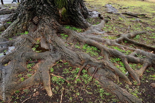雨に濡れるユリノキの古木の根