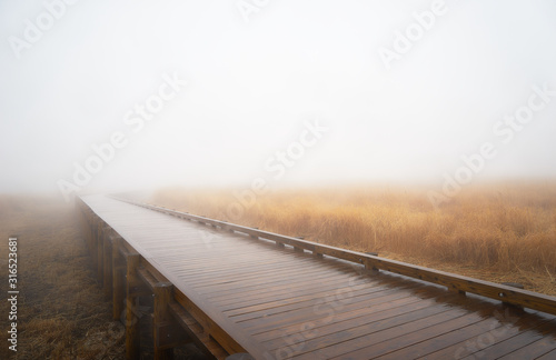 霧の草原の風景。 大分県長者原で撮影。 阿蘇くじゅう国立公園。