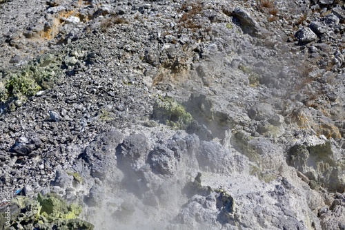 荒涼とした雲仙地獄と吹き上げる水蒸気の情景@長崎