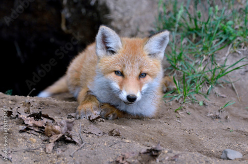 巣穴から出てきたキタキツネ(北海道・知床)