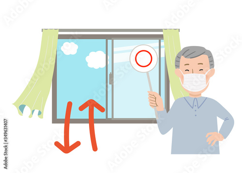 丸の札を持ってマスクをするおじいちゃんと窓を開けて換気するベクターイラスト