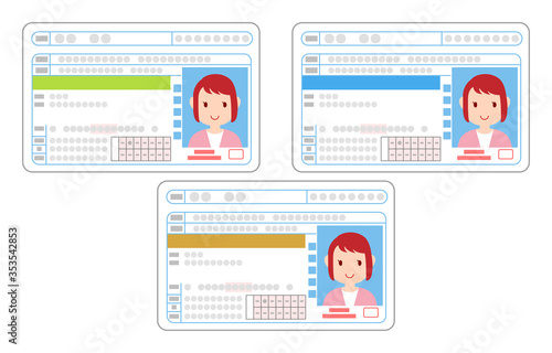 運転免許証の表面、初心者・一般、優良ドライバーの女性のイラストセット