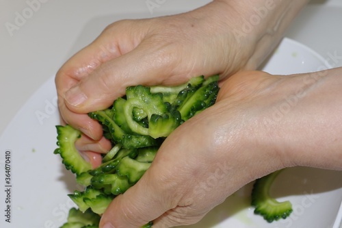 ゴーヤを塩もみしているシーン