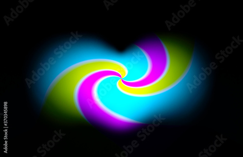 黒バックにカラフルな薄巻きがハート型に見える背景 黒バックに水色、黄色、ピンクのうずまき