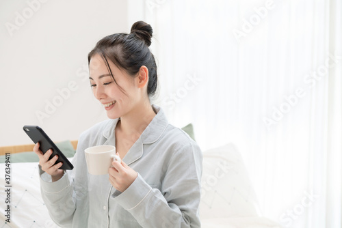 パジャマを着てスマホを見る女性