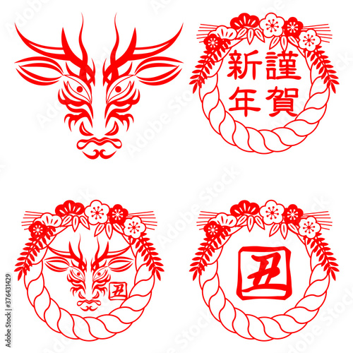 スタンプ風イラスト セット:歌舞伎のメイク風の牛の顔のデザイン(隈取)しめ縄飾り 丑の漢字 ベクター