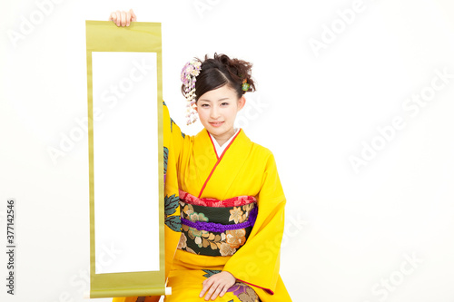 掛け軸を持つ振袖女性