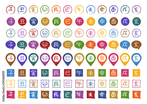 カラフルな十二支のアイコンイラストセット: 手書き文字