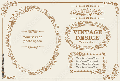 アンティークなお花の装飾フレーム、飾り罫、オーナメントのベクターセット。フォトフレームなどに。