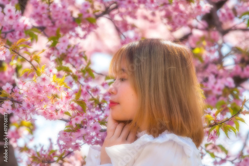 河津桜と若い女性