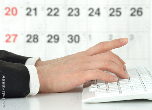 カレンダーの前でパソコン作業を行うビジネスマンの手